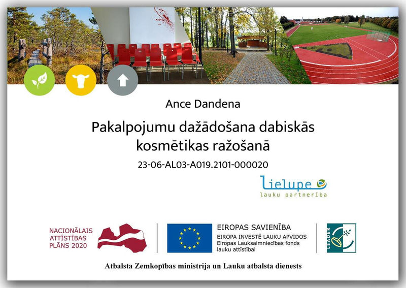2023. gadā realizētā LEADER projekta „Pakalpojumu dažādošana dabiskās kosmētikas ražošanā” īstenošanas mērķis bija izveidot jaunu pakalpojumu saimniecībā – ekskursijas ārstniecības augu dārzā un meistarklases kosmētikas gatavošanā, lai paplašinātu darbību un ieviestu jaunus pakalpojumus.